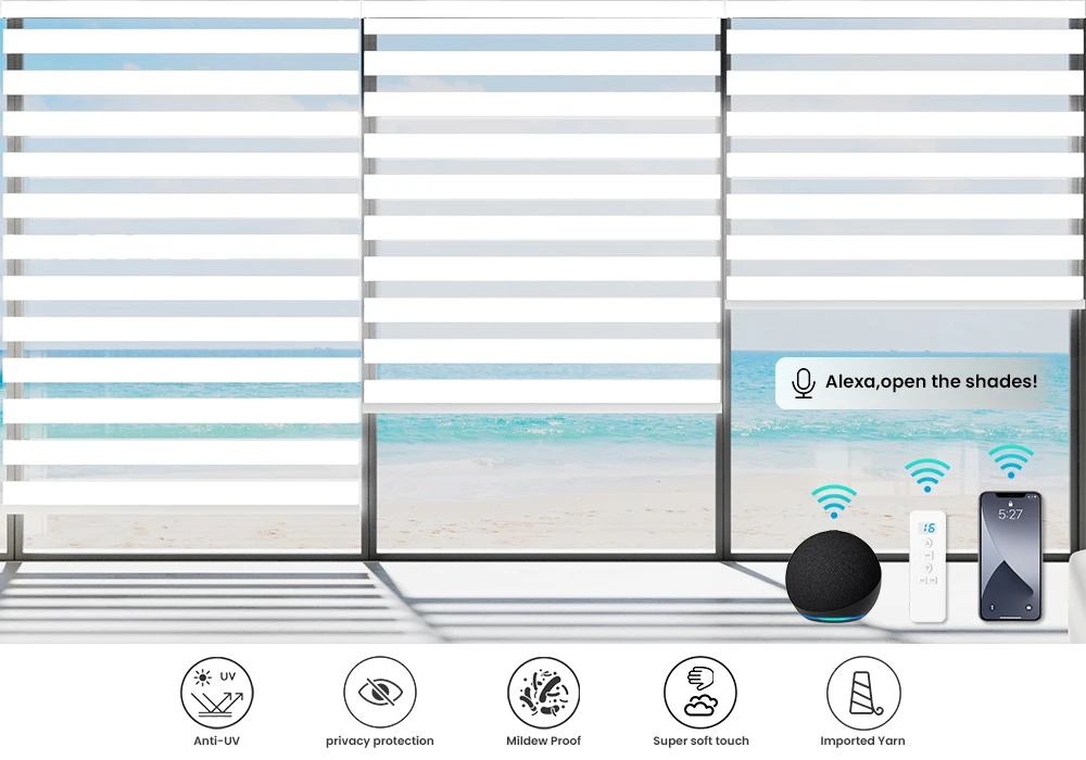Feature: Automatic,Waterproof,Anti-Uv,Eco-Friendly,Durable,Fireproof,Sunscreen,100% blackout,Dual Layer,Support APP, WIFI, remote control